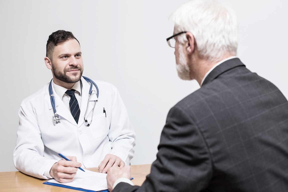 middle aged men with gray hair and beard at men doctor room find out his diagnosis